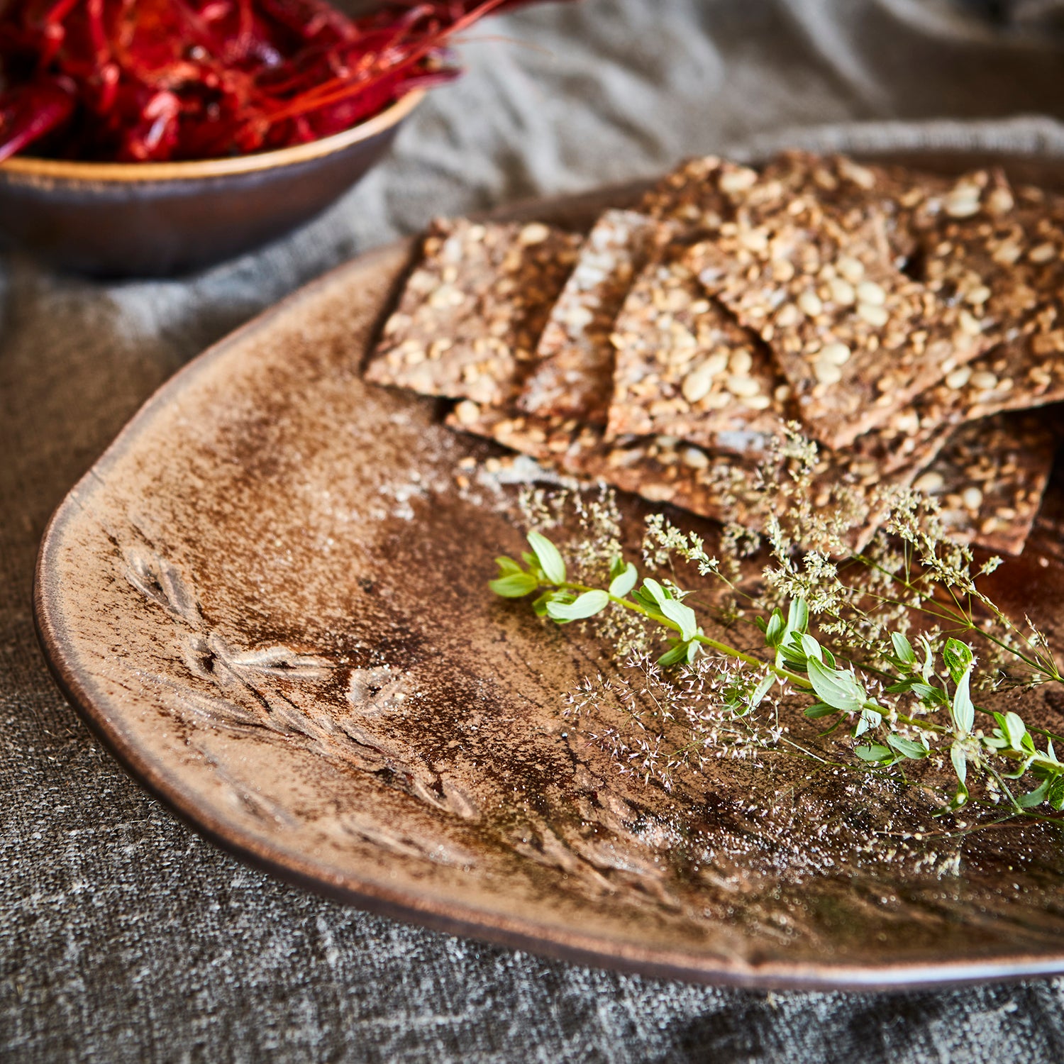Med sin jordnære farge og rustikke overflate er dette et fat til tapas og passer perfekt inn i en naturlig og uformell borddekking, enten til hverdags eller fest.