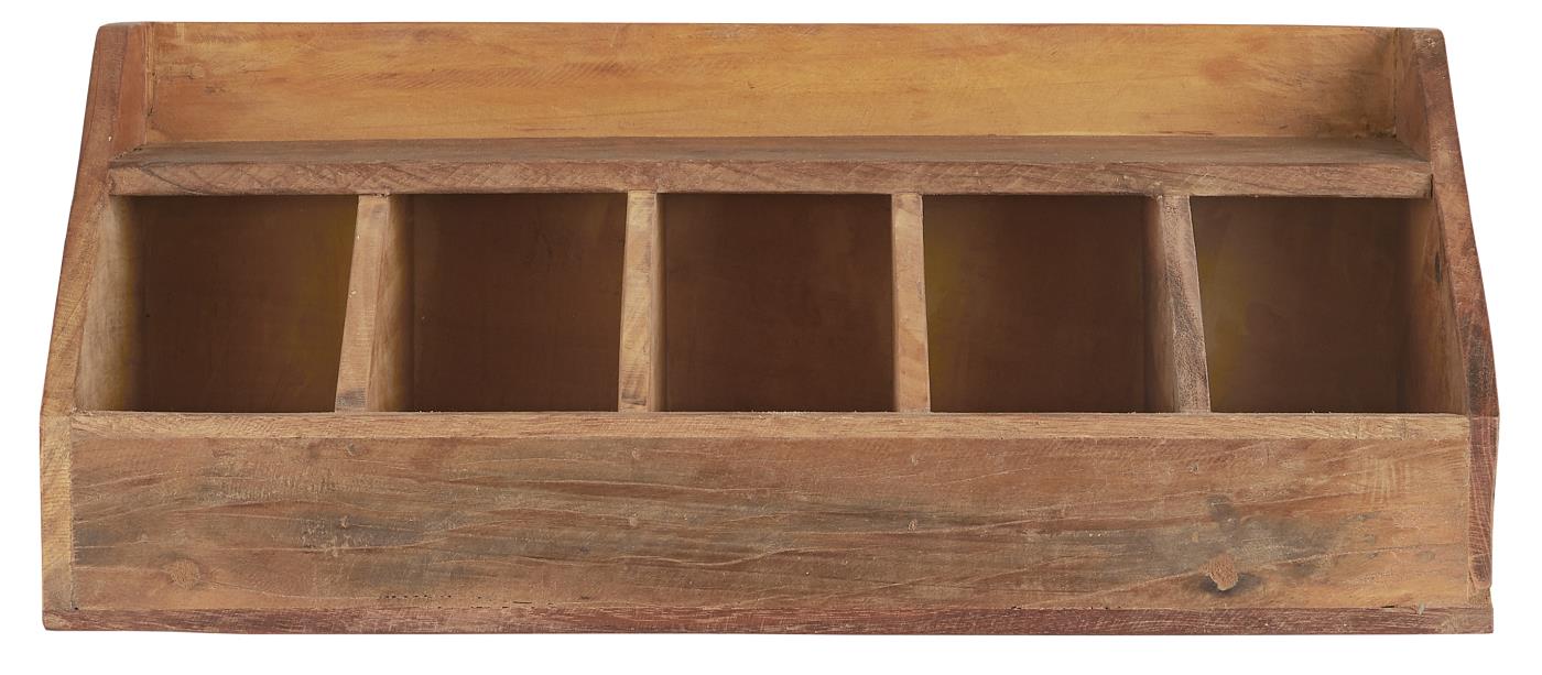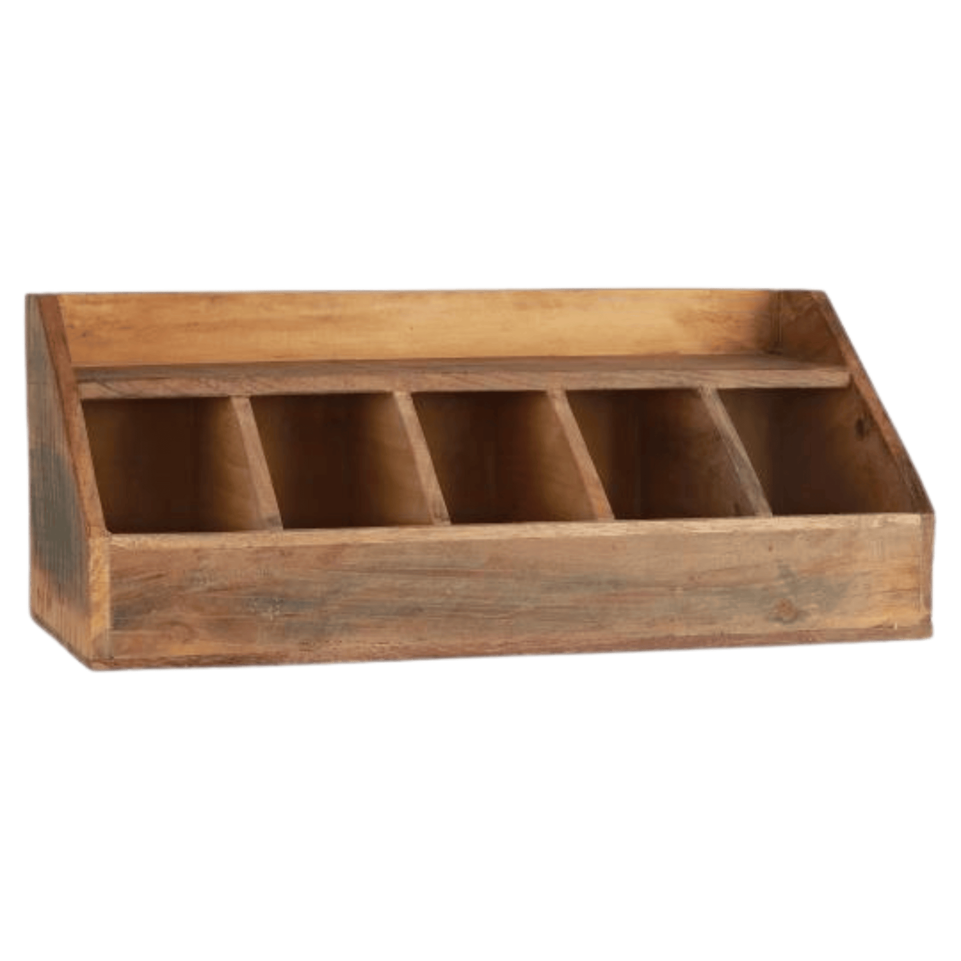Denne unike bestikkesken er laget i India av resirkulert tre, noe som gir hvert eksemplar et særegent preg med naturlige variasjoner i farge og struktur. Med sine fem romslige rom er den ideell for å organisere bestikk, kjøkkenredskaper eller småting. Det tidløse designet og den varme trestrukturen gjør den til et dekorativt og praktisk tilskudd til både kjøkkenet og hjemmet generelt.