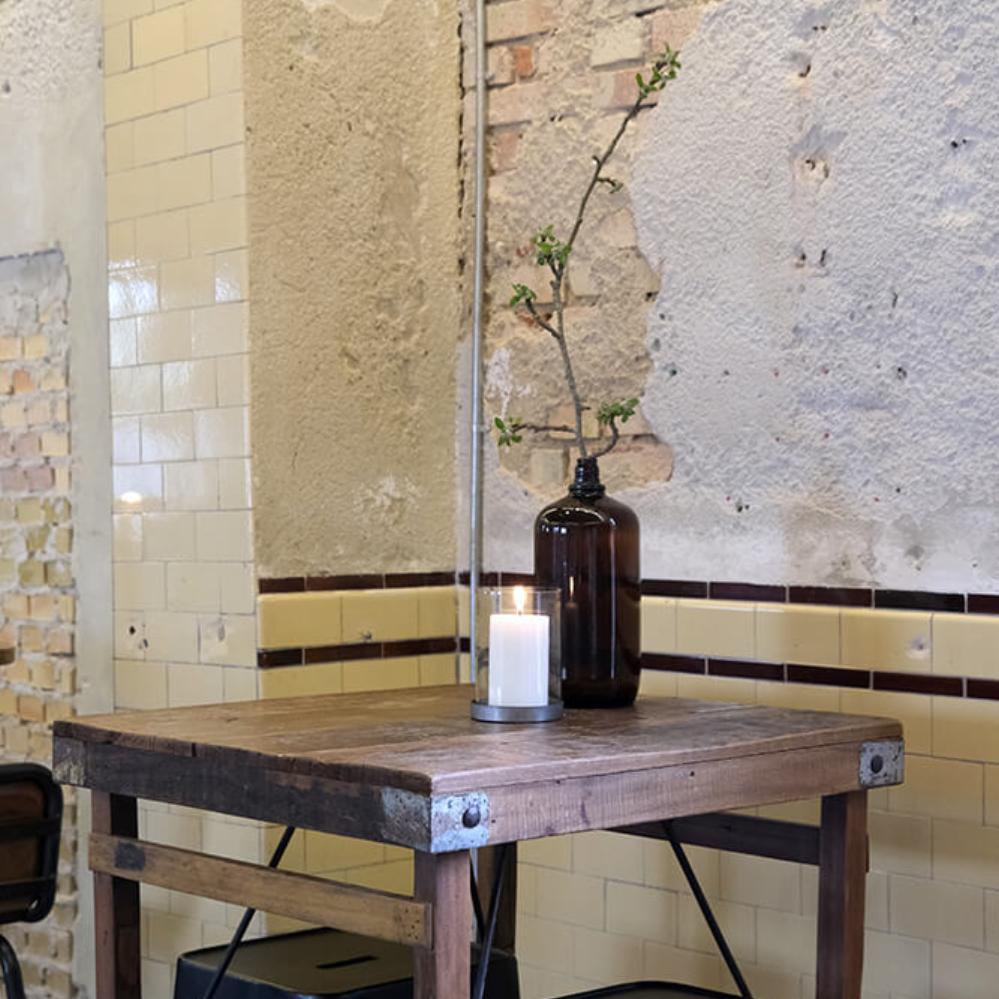 Den rå og industrielle stilen kombineres med varme toner i treverket, og passer særlig godt sammen med våre barstoler i lær eller lin. Et møbel som både tåler bruk og eldes med skjønnhet.
