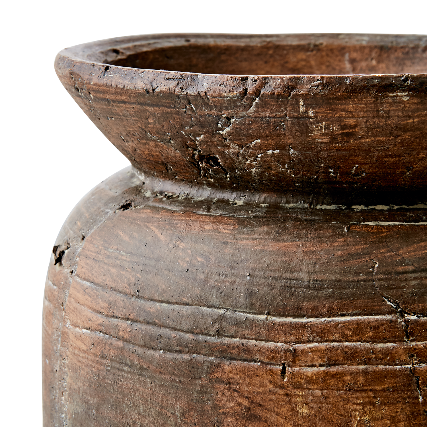 Denne rustikke Camille-krukken i dypbrun terrakotta bringer frem varmen fra gamle håndverksmetoder og naturlige materialer. Med en autentisk patinert finish, tydelige bruksspor og et uperfekt uttrykk, er dette en dekorativ antikkrukke i wabi-sabi stil – perfekt for deg som elsker interiør med sjel.