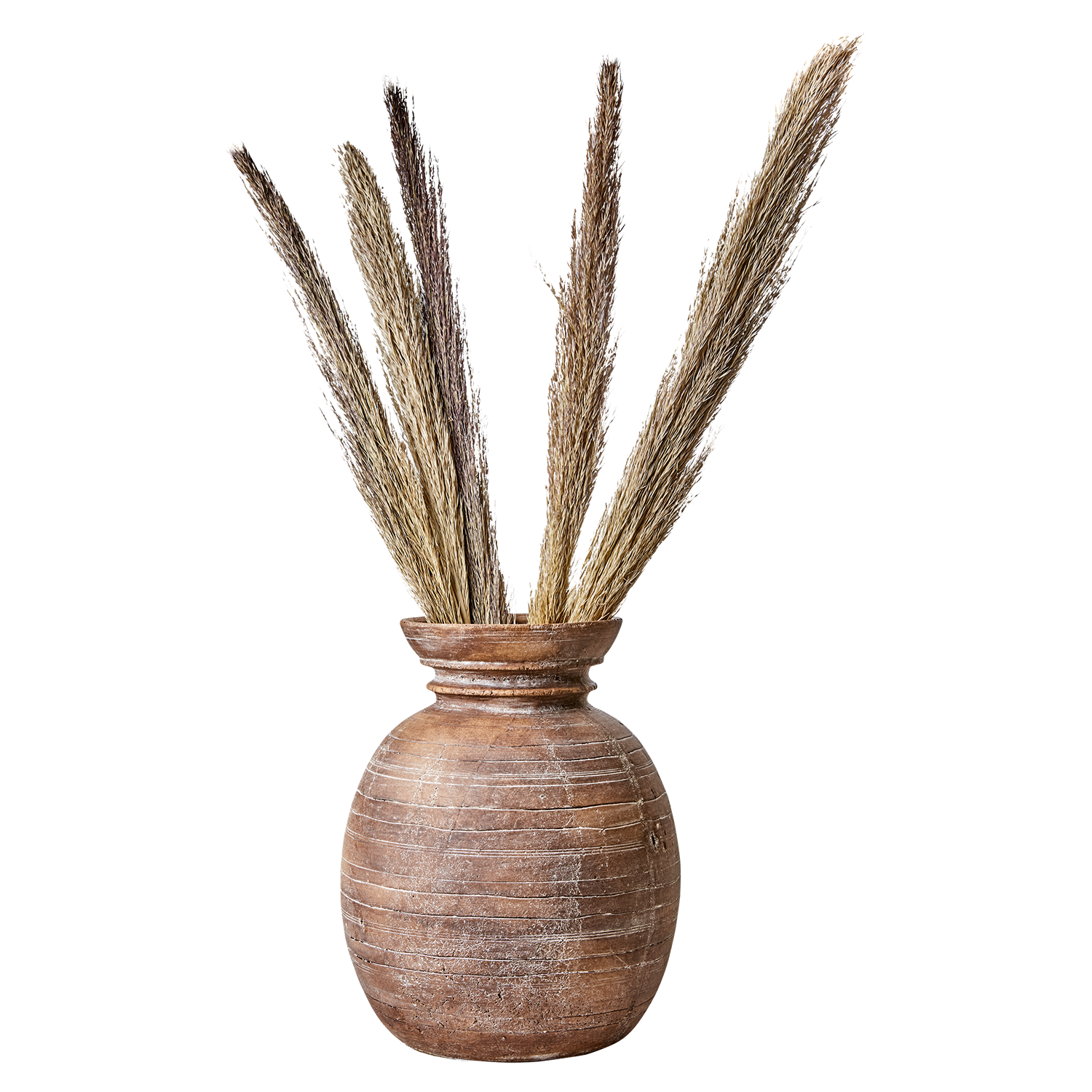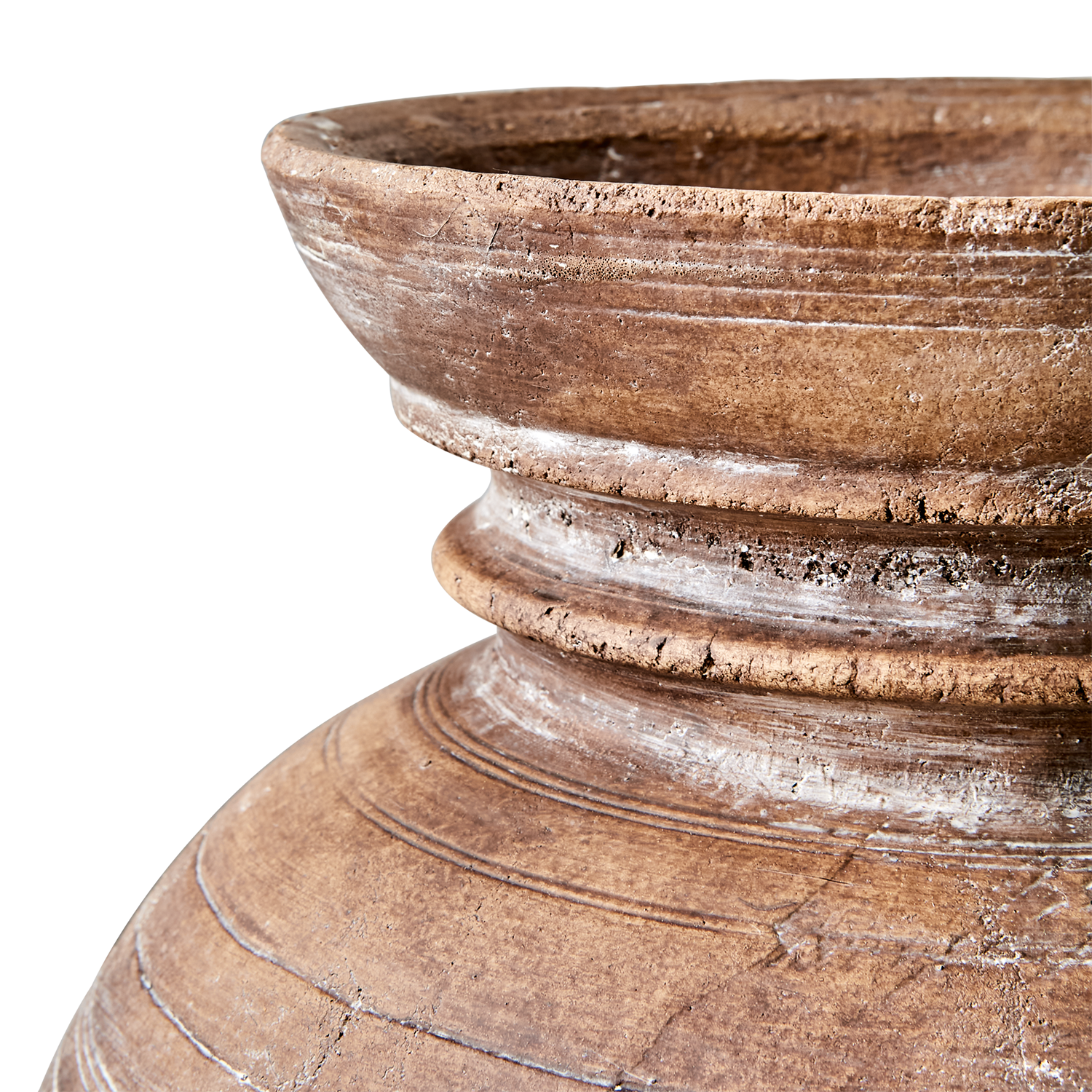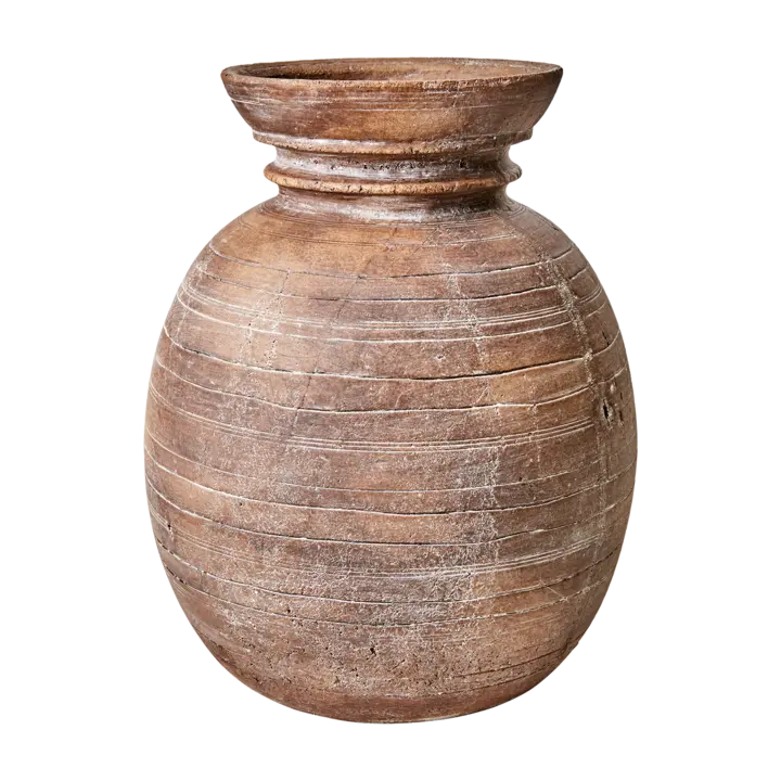 Utforsk den rustikke sjarmen til denne lille terrakottakrukken med avsmalnende topp og antikt utseende. Inspirert av en gammel indisk tre-mjølkekanna, gir denne replikaen en naturlig vintage-look til ethvert rom. Laget av solid terrakotta, er den perfekt som en solitær eller som en blomster- eller utterkrukke for grønne planter. Dette en tidløs skatt som vil legge til karakter og sjarm i hjemmet ditt.