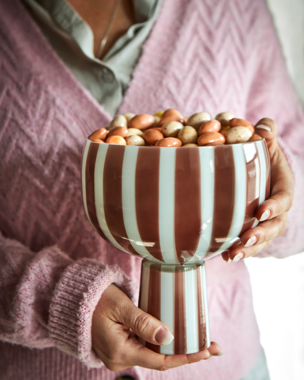 Utforsk et imponerende tillegg til ditt serveringsbord med vår dekorative godteriskål på stett, en sjarmerende blanding av grå og hvite striper som gir den et elegant preg. Denne bollen perfekt for servering av godsaker eller snacks på spesielle anledninger eller for å legge til et snev av elegant rustikk til hverdagslige øyeblikk.