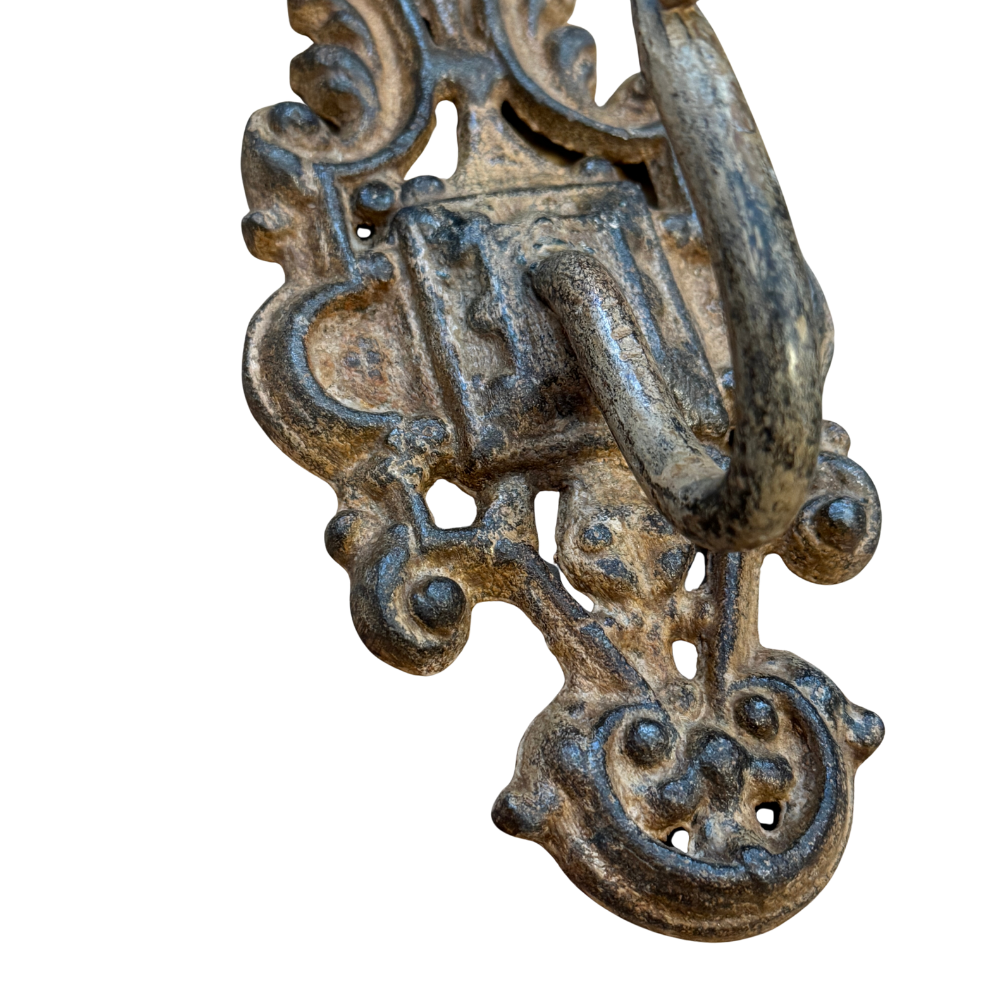 Dekorativ krok i støpejern med vintage-inspirert design. Kombinerer funksjonalitet og karakter, og passer perfekt i hjem med rustikk, klassisk eller nostalgisk stil. De detaljerte ornamentene og den patinerte overflaten gir en autentisk følelse av historie og håndverk – som hentet fra en gammel herregård eller verksted.