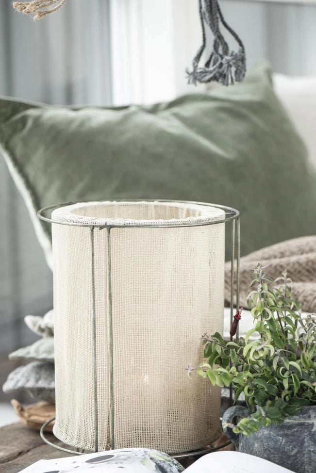 Lykten er laget med en stabil og dekorativ metallramme som gir struktur og eleganse, mens det beige stoffet gir et organisk og dempet uttrykk. Den passer perfekt på stuebordet, i vinduskarmen, på soverommet – eller ute på en skjermet terrasse.