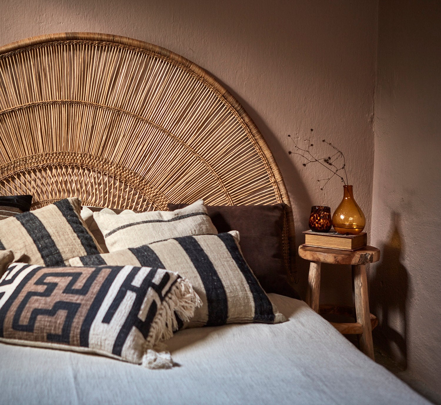 Gi sofaen, lenestolen eller sengen et løft med denne karaktersterke pynteputen i natur, svart og rust. Med sitt iøynefallende grafiske mønster og dekorative frynser, skaper den et rustikt, bohemsk og håndverksinspirert uttrykk i hjemmet. Fargene i jordtoner gjør den enkel å kombinere med både duse og mørkere nyanser.