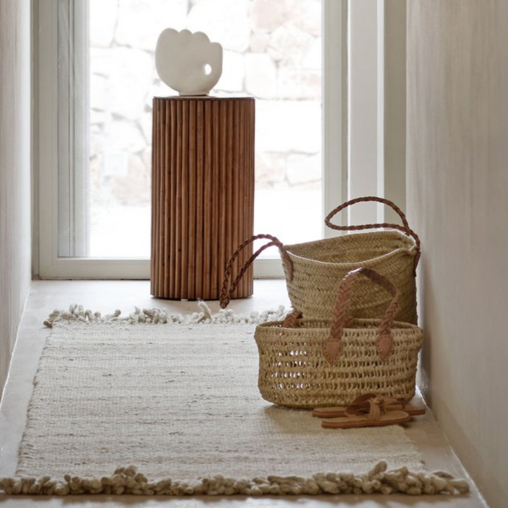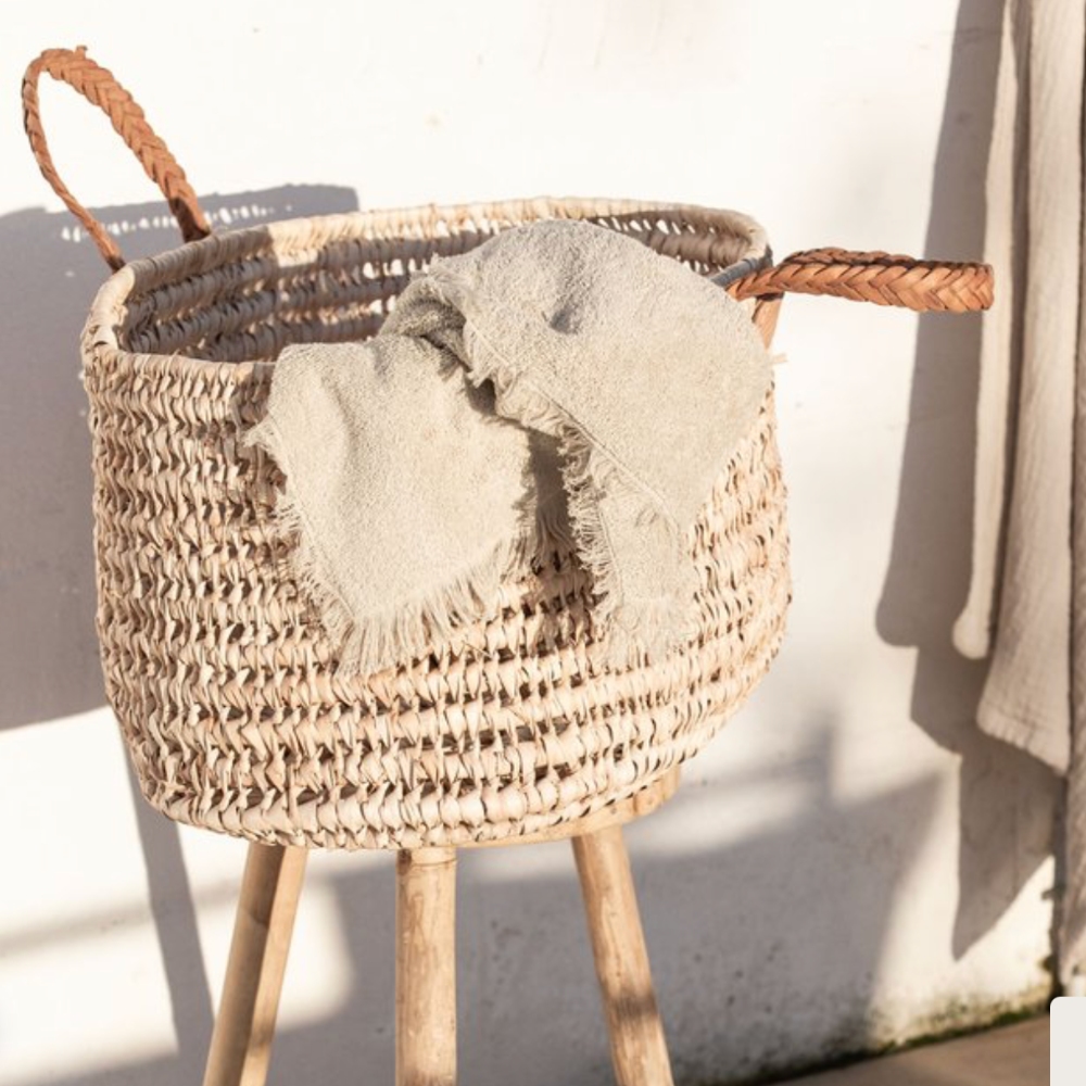 Kurven er laget for hånd av slitesterke palmeblader som gir et rustikt, luftig og naturlig uttrykk. De brede, flettede skinnhåndtakene sørger for komfort og holdbarhet, enten du bærer den i hånden eller setter den på gulvet som oppbevaringskurv.
