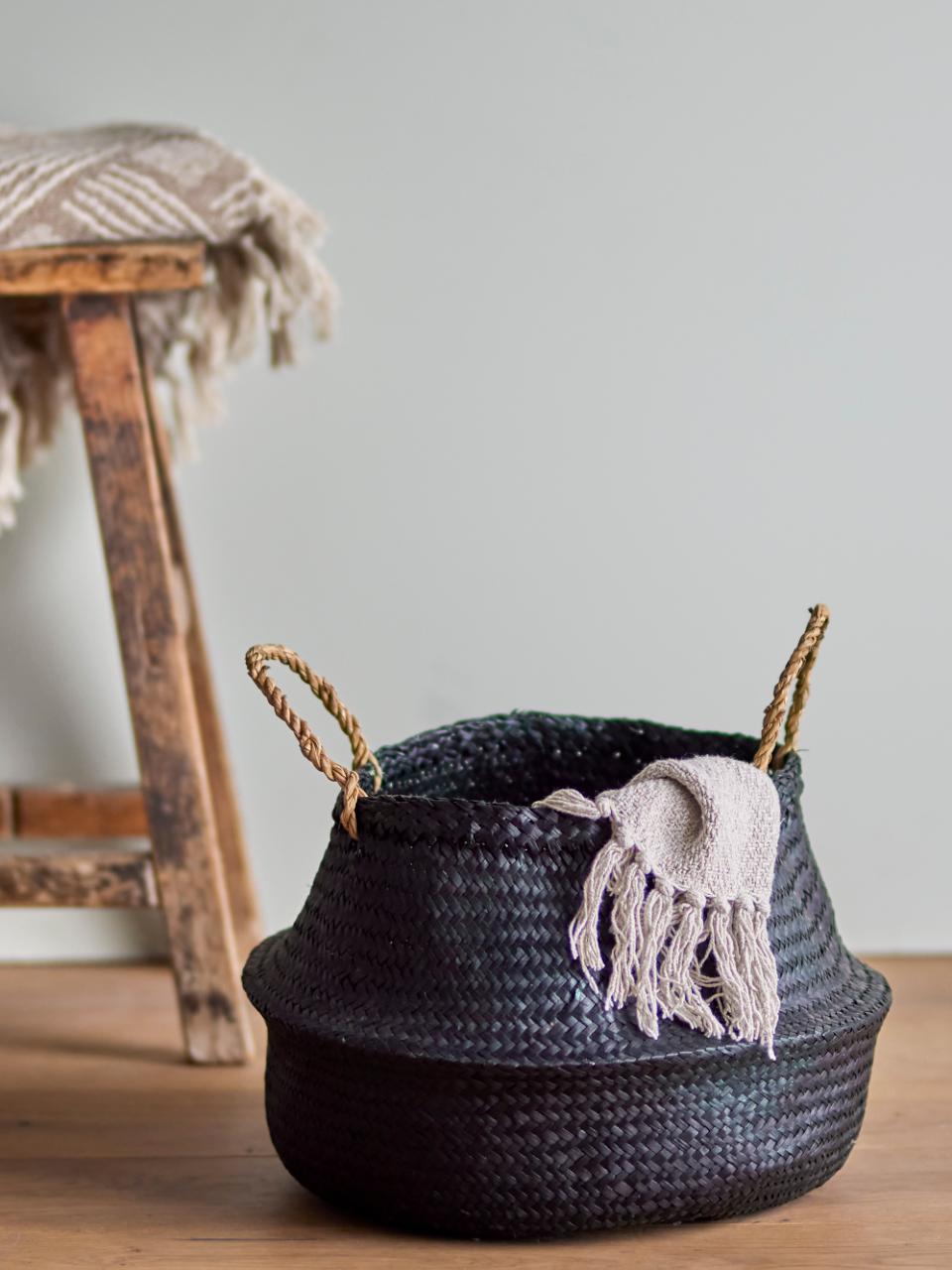 Floria kurv fra Bloomingville er en stilren og håndvevd kurv laget av naturlig sjøgress, farget i elegant svart. Den romslige og fleksible formen kombinert med praktiske bærehåndtak gjør den både dekorativ og anvendelig i hverdagen.