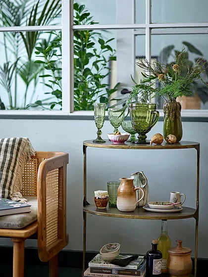 Florie-muggen i grønt presset glass er et elegant og tidløst innslag på bordet. Med sin dype grønne farge og detaljerte, vintage-inspirerte mønster henter den inspirasjon fra Art Nouveau-stilen, noe som gir et eksklusivt og nostalgisk preg.