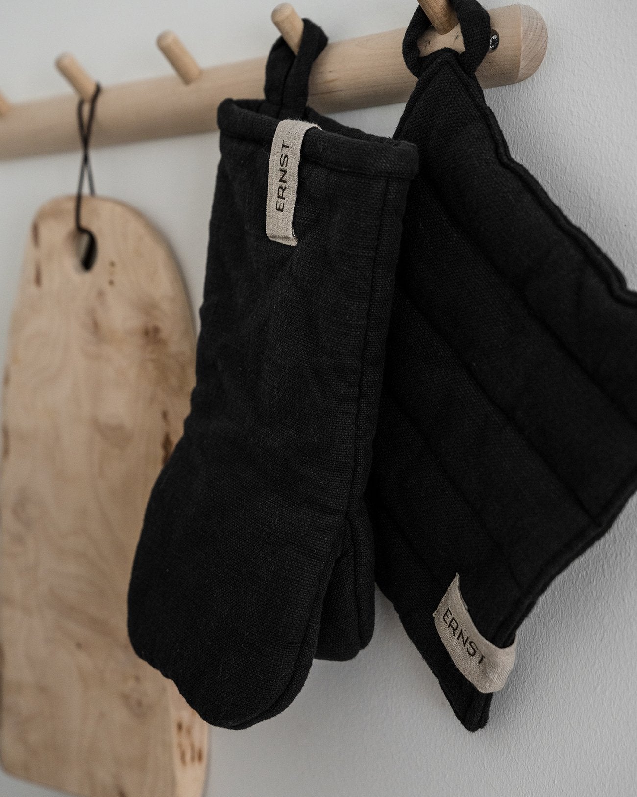 Gjør matlagingen trygg og stilfull med ERNST gryteklut i svart bomull. Laget av 100 % naturlig bomull med myk tekstur og god tykkelse, beskytter den hendene dine mot varme gryter og former. Den vatterte designen gir et godt grep, mens den diskré hempe gjør den enkel å henge fremme som en del av kjøkkenets dekor.