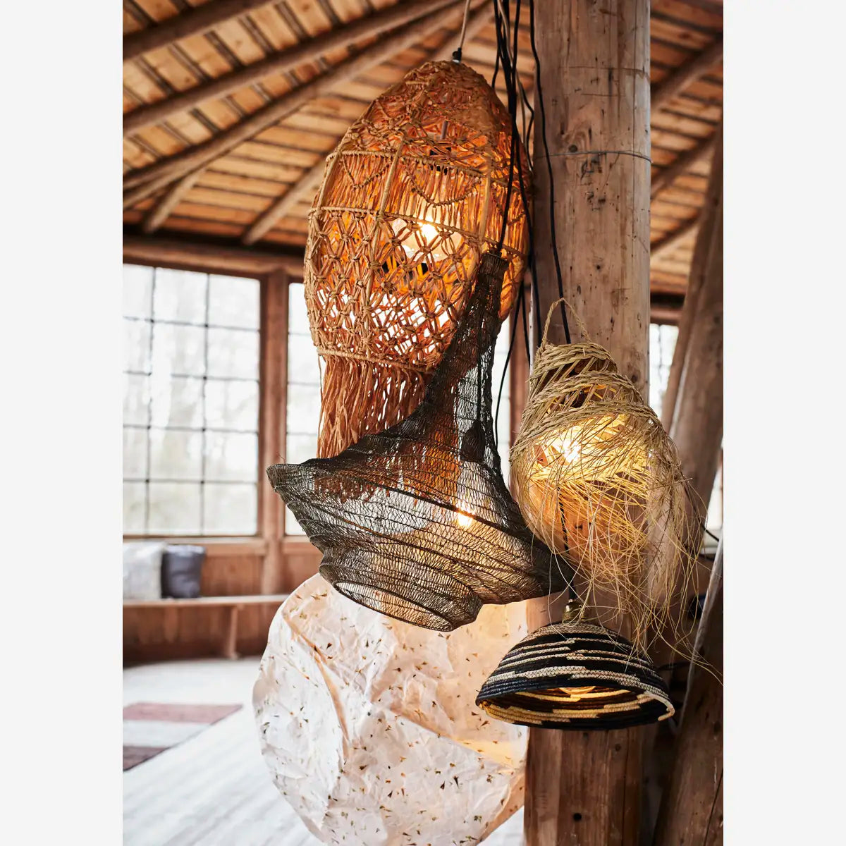 Den skulpturelle formen og den delikate metallstrukturen skaper et varmt og stemningsfullt lys som filtreres gjennom jernet. Perfekt over spisebordet, i stuen eller i et åpent rom der du ønsker å kombinere rå håndverksfølelse med tidløs design.