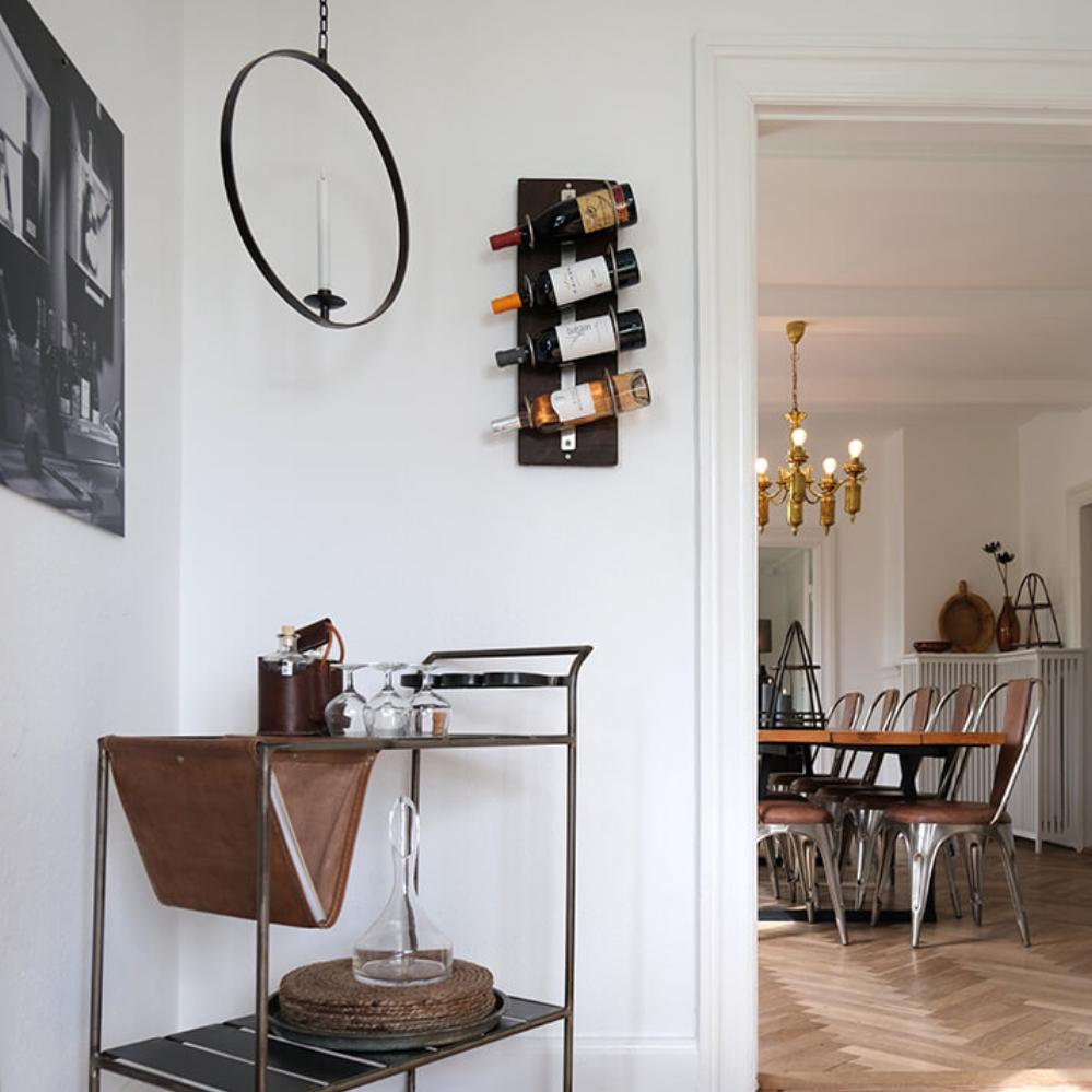 Denne vegghengte vinholderen rommer fire flasker og passer ideelt i både små og store rom. Den kan brukes alene eller settes sammen med flere for å skape en helhetlig vinvegg. En tidløs detalj som passer like godt i moderne kjøkken som i rustikke omgivelser.