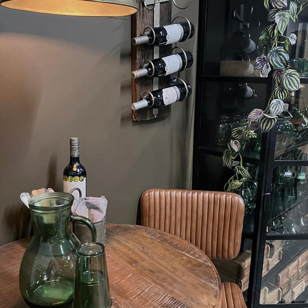 Gi hjemmet ditt et varmt og karakterfullt uttrykk med denne rustikke vinreolen laget av resirkulert tre og jern. Hver reol er unik med naturlige variasjoner i treverket, noe som gir et autentisk og levende preg. Den solide metallrammen med fire flaskeringer kombinerer industriell stil med bærekraftig håndverk – perfekt for deg som verdsetter naturlige materialer i interiøret.
