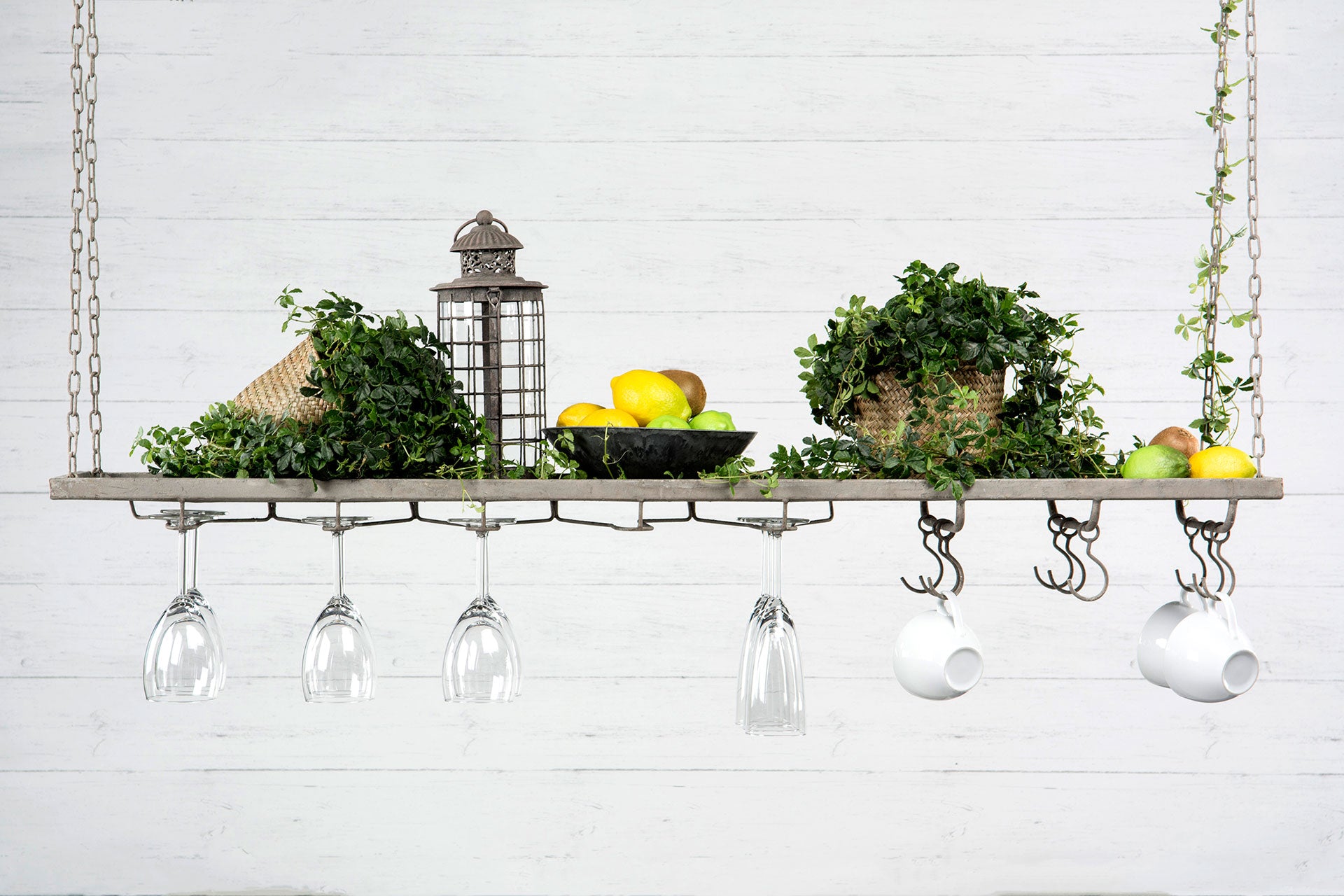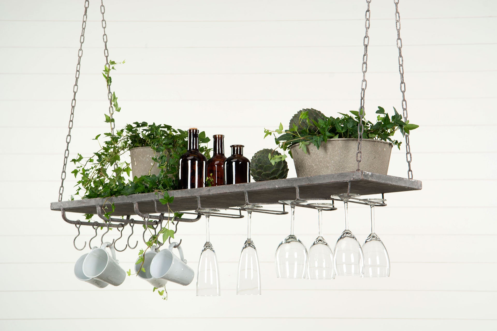 Hyllen er laget i metall og henges opp i solide kjettinger, noe som gir et industrielt og samtidig varmt preg. Perfekt over kjøkkenbenken, i spisestuen eller som en dekorativ løsning i uterom eller vinterhage.