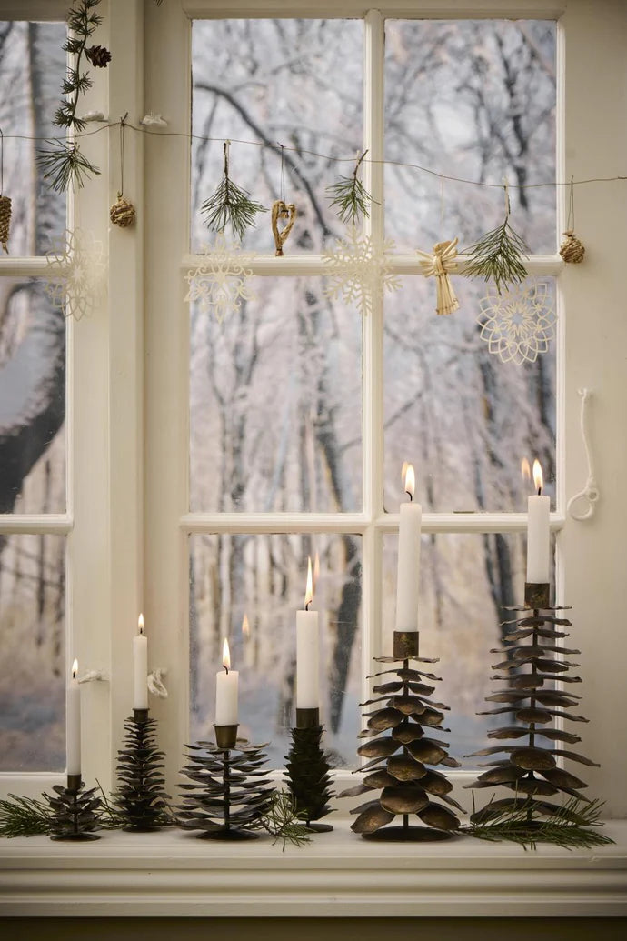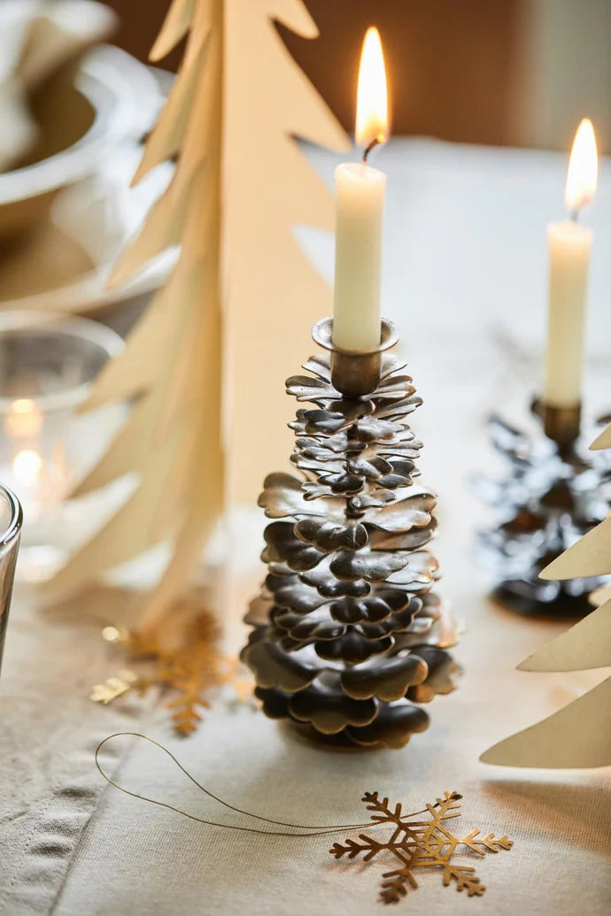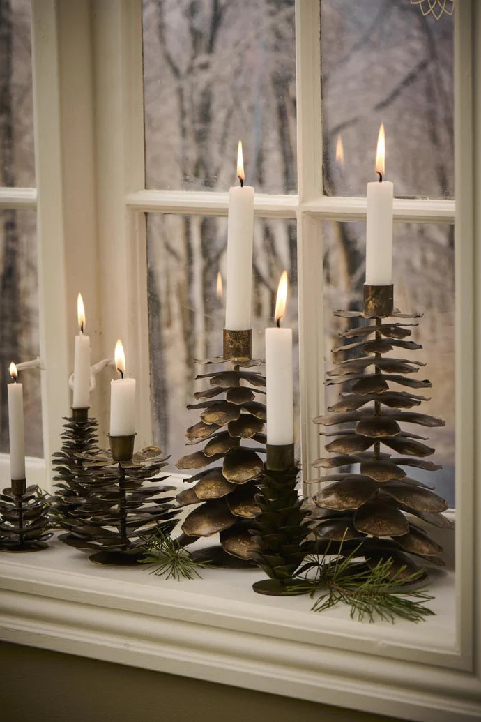Dette er en lysestake formet som en kongle, laget i metall med en myk messing-tone. Formen er enkel, men har tyngde og nærvær. Den gir lys og varme uten å bli pyntete, og passer like godt i adventstiden som resten av vinteren. Plasser den alene i vinduskarmen, eller sett flere sammen i ulike høyder for et roligere og mer samlet uttrykk.