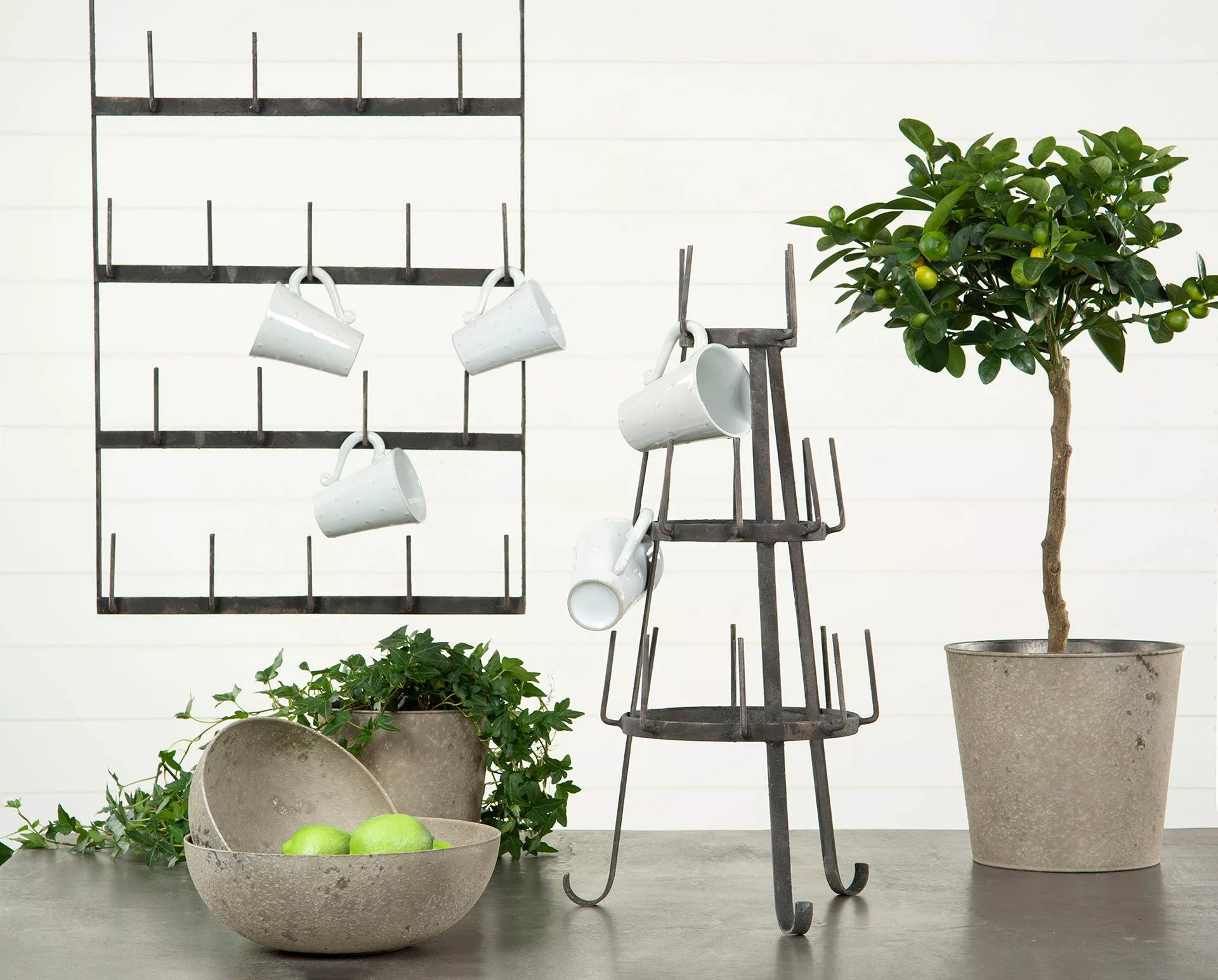 Stativet har tre nivåer med solide metallpigger, perfekt for å henge kopper, krus eller små kjøkkenredskaper. Den robuste konstruksjonen og den patinerte overflaten gir en autentisk vintage-look som passer både moderne og landlige kjøkken.