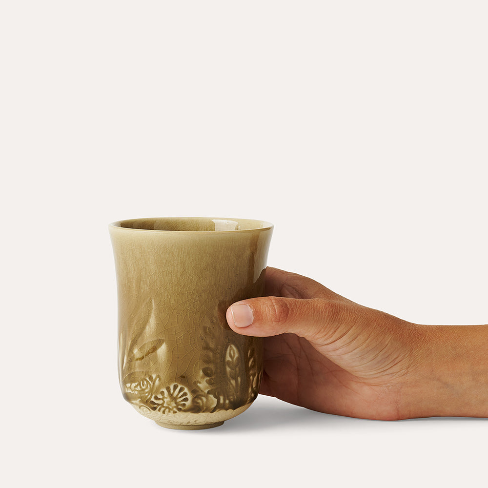 Alle koppene er laget i slitesterkt stengods og har glasur på innsiden. Den dekorative utsiden fremhever møtet mellom glasur og brent leire, noe som gir koppen karakter og dybde.