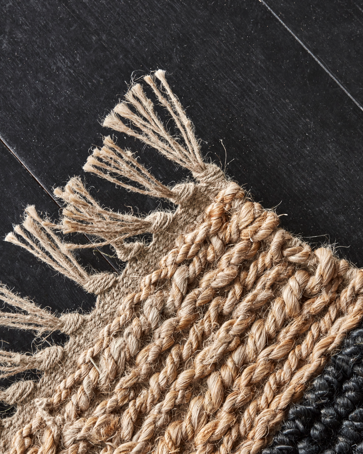 De håndknyttede frynsene understreker det autentiske uttrykket, mens fargekombinasjonen natur og sort gjør teppet enkelt å kombinere med både moderne og rustikke interiører.