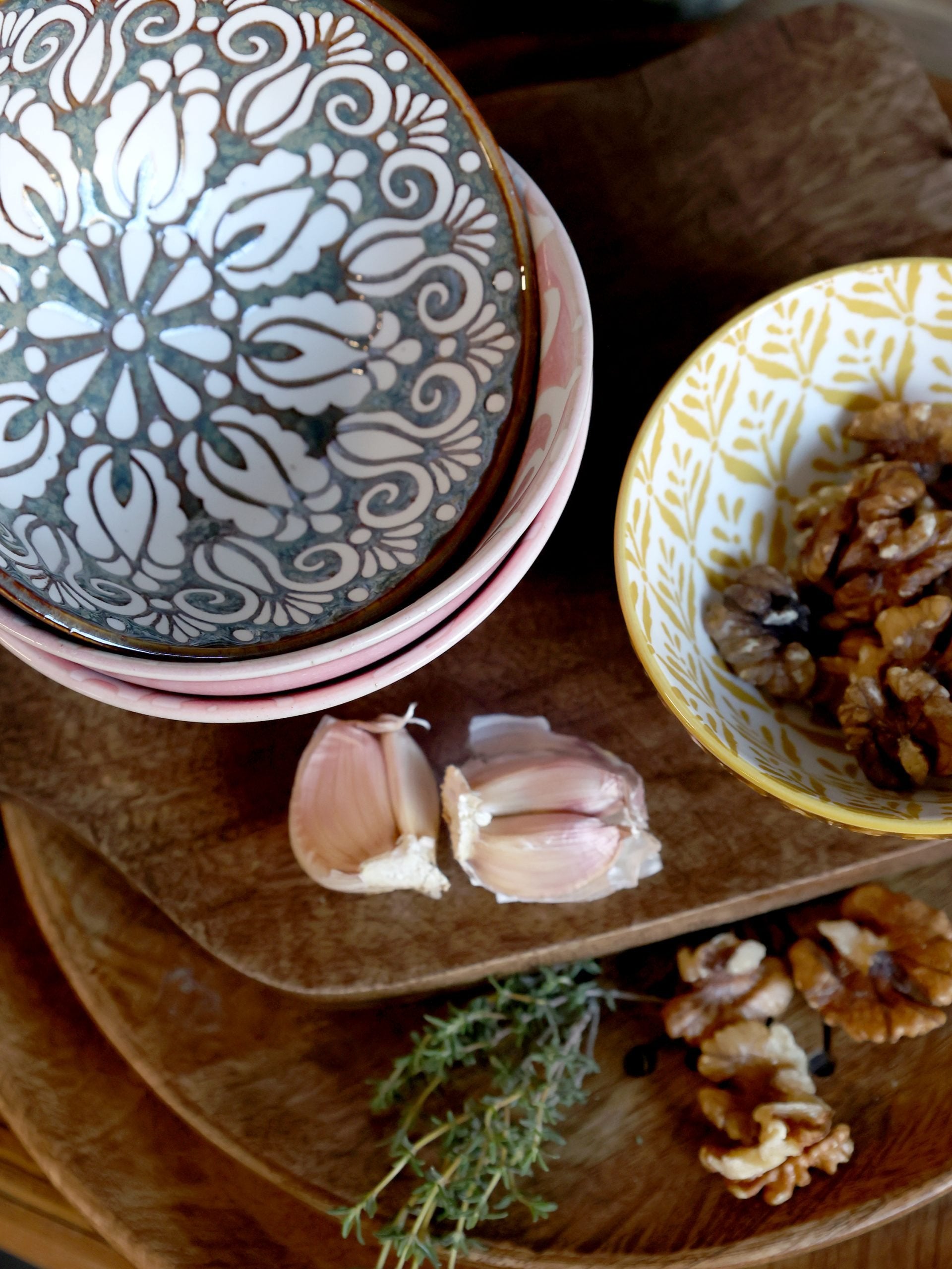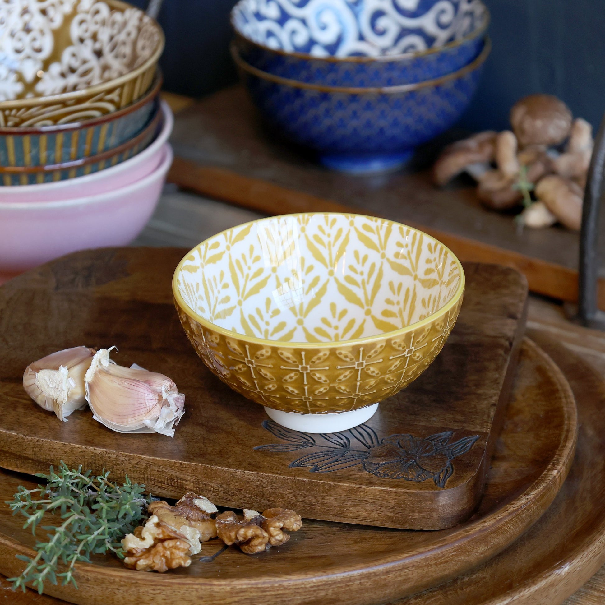 Arés Mønstret porselensskål i fargen honning er en liten, stemningsfull skål som kombinerer varme jordtoner med et håndmalt uttrykk. Innsiden har et delikat botanisk mønster i sennepsgult, mens utsiden viser et geometrisk mønster i dype honningtoner – en perfekt balanse mellom moderne design og rustikk sjarm.