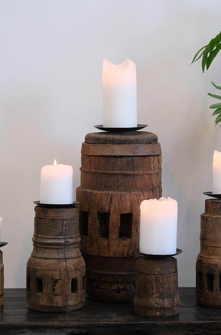 Hver lysestake er unik og bærer spor av tid og håndverk, som gir en autentisk karakter og et varmt uttrykk til rommet.