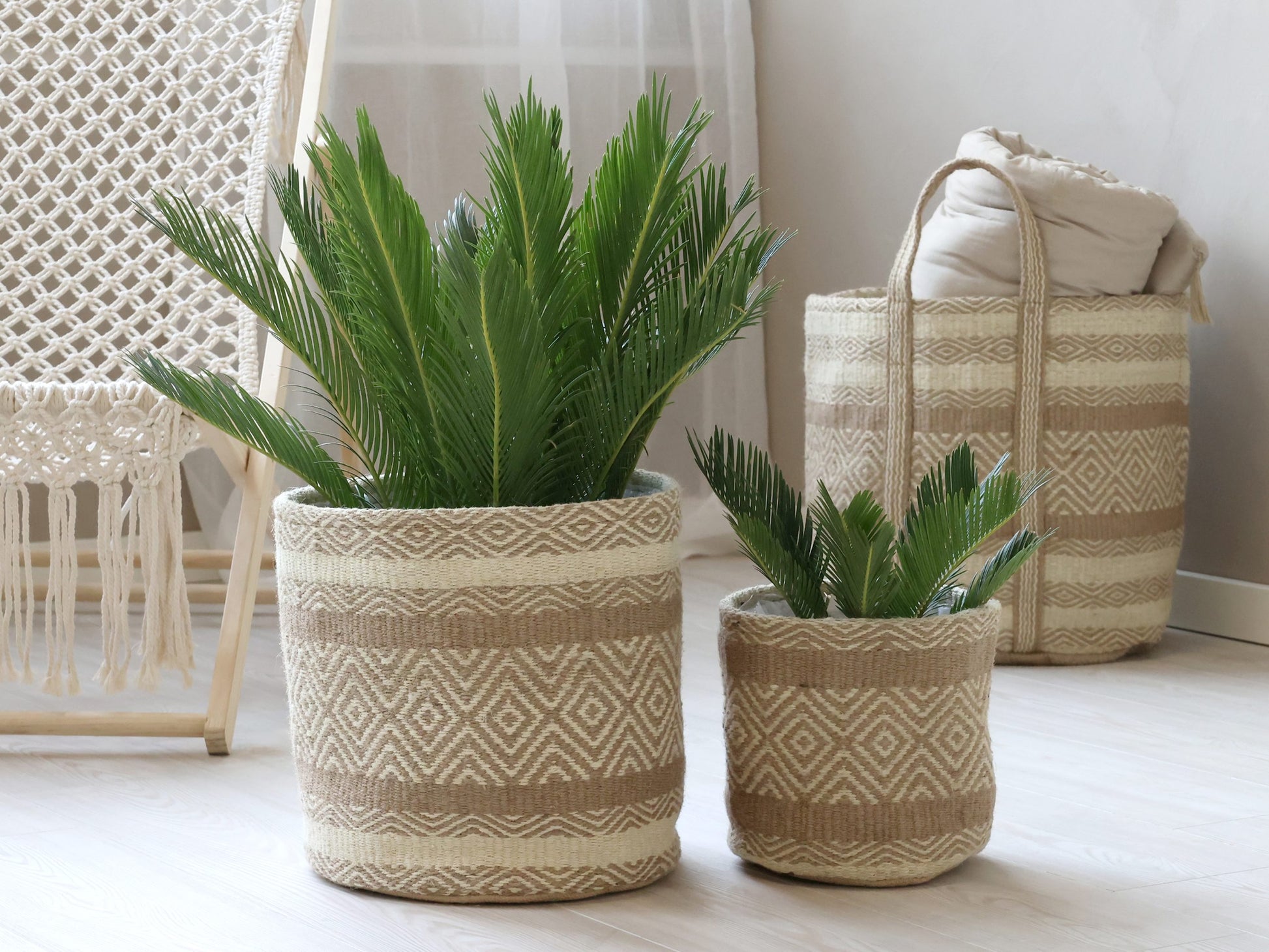 Denne håndvevde potteskjuleren kombinerer funksjon og estetikk med sitt tidløse mønster i beige og krem, perfekt for både moderne og rustikke interiør.