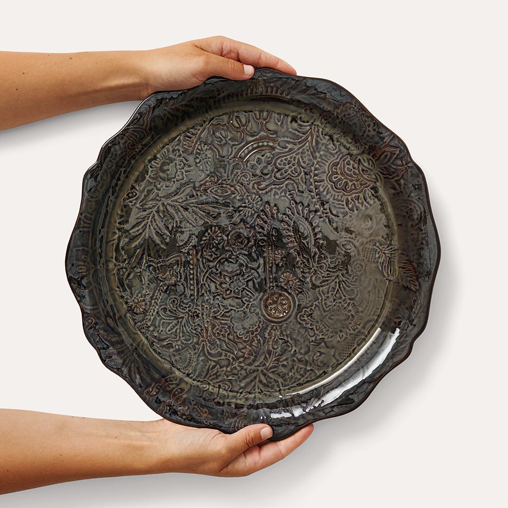 Den dype, fikenbrune glasuren er en såkalt effektglasur med små krakeleringer og livlige fargetoner som gjør hvert fat unikt. Det intrikate arabesque-mønsteret gir en bohemsk og luksuriøs følelse, og gjør at fatet passer like godt til hverdagsbruk som til fest.