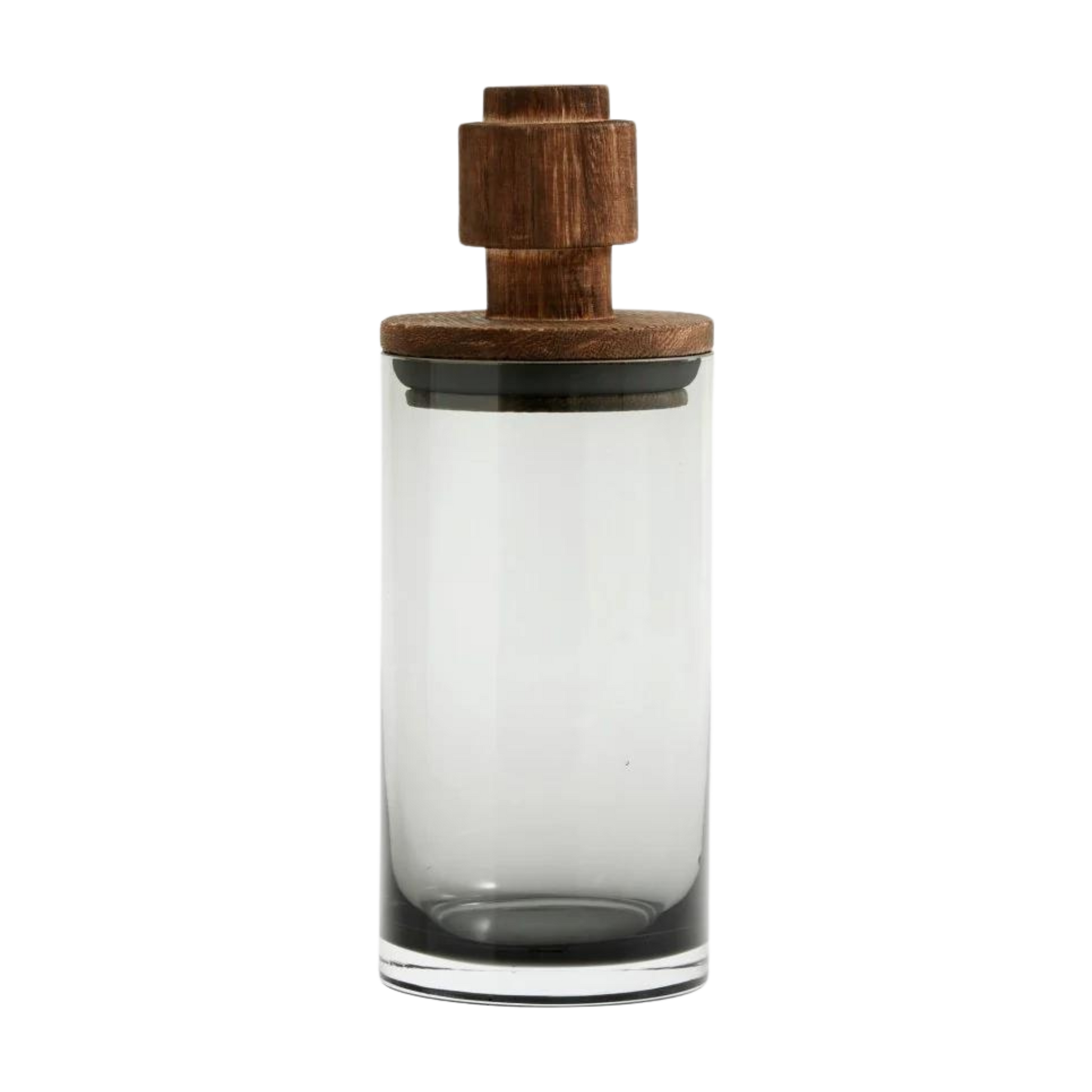 Det solide glasset gir et rent og tidløst uttrykk, mens lokket i mørkt paulownia-tre tilfører varme og karakter. Hvert lokk er unikt med sine naturlige utskjæringer og fargevariasjoner, noe som gir krukken et rustikt og eksklusivt preg. En silikonring under lokket sørger for tett forsegling og trygg oppbevaring av matvarer.