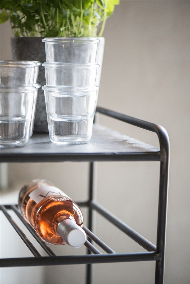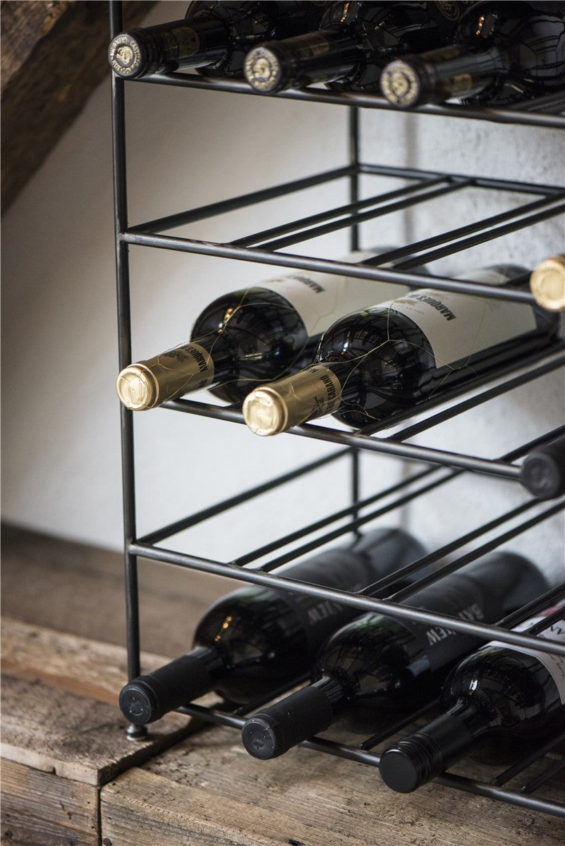 Dette vinstativet i metall kombinerer funksjon og stil i ett tidløst design. Med sitt industrielle uttrykk og fabrikk-svarte metallramme gir det både karakter og orden til vinrommet, kjøkkenet eller stuen. Den åpne og robuste konstruksjonen gir plass til opptil 30 vinflasker, perfekt både for vinelskere og samlere som ønsker å vise frem samlingen sin med stil.